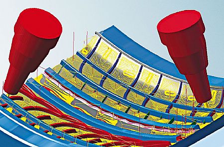 The machining of the complex geometries in tread patterns is implemented by the automation technology in hyperMILL® in such a way that all tool movements are calculated as efficiently as possible. In a method that carefully calculates the machine tool and cutting tool, hyperMILL® automatically calculates collision-free tool positions. This means that machining operations with various tool orientations can be generated quickly and simply in a single operation. In particular, the automatic tool positioning substantially reduces the amount of time that is required to program the intricate structures of tyre moulds. The cutter also moves closer to the object. This is credit to the simultaneous, collision-tested movement that makes sure redundant movements are avoided.