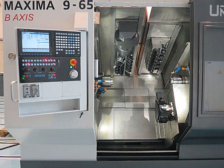 The latest addition to the Maxima 9 Series is the Maxima 9-65B that was launched at the Toulouse aerospace exhibition SIANE in October. Incorporating a 12 tool position upper left slide with high powered motorised tooling and B-axis positioning, the Maxima 9-65B permits complex component manufacture without the need for 90 degree or adjustable tool holders. This upper left gang slide offers quick change fixed or rotary tool stations for working on the main spindle.