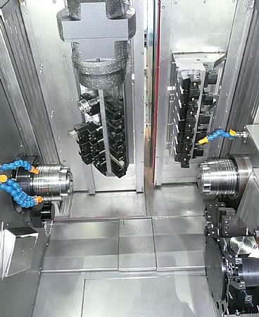 This multitude of tool stations provides a wealth of simultaneous combined machining scenario's such as 3 tools cutting with balance turning on main spindle, main spindle turning and drilling whilst drilling on the counter spindle, counter spindle support with 4-axis turning or alternately Y-axis milling on main spindle whilst cross drilling on main & turning on counter spindle.