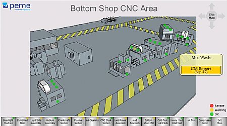 From this, Peterborough based PEME implemented its unique PEME Condition Register (PCR) internet based system that provides a real-time dashboard that displays Key Performance Indicators (KPI's), CBM data and reports plus safety audit information. The PCR system provides Autocraft personnel with site reports that consist of a graphical interactive map view displaying 3D graphical models of the customer's whole facility as well as a breakdown by section and machine. This enables the Autocraft maintenance department to navigate around their factory or specified section and view the latest condition of the on-site assets by use of a visual traffic light system that identifies the condition of each machine. The maintenance team are prompted by an email from the PCR to conduct a remedial activity such as a change of oil, a new motor or drive belt.