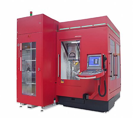 Housed in a clear glass cabinet to improve operator visibility, this innovation significantly improves tool change times and thus reduces non-machining times. This cabinet offers ideal automation conditions and therefore makes the KERN Micro the perfect machine for serial production. To demonstrate the KERN Micro's automated production credentials, the HSK40 machine was recently demonstrated at AMB with a compact Erowa Robot Automatic Workpiece Loading System.
