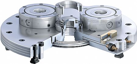 By means of the patented double angled stroke and the integrated turbo function, the NSL Turn achieves pull-down forces of up to 125kN with holding forces of up to 375kN. Therefore the clamping station from the innovative family-owned company ensures extremely rigid and reliable clamping of devices and workpieces. A centering taper ensures a runout accuracy of less than 0.01mm. Locking of the three or five integrated clamping modules is done via two clamping slides. It is self-locking and uses form-fit clamping. During machining, the clamping station is unpressurized. Integrated springs provide permanent and secure clamping. For opening and locking, a pneumatic system with a pressure of 6 bar is sufficient.