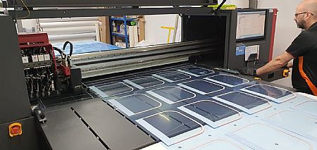 The facemask consists of a 0.5 mm PETG visor, an elasticated strap that is pre-cut to length and foam padding that is applied to the visor to create an element of comfort for the healthcare user. “The PETG sheets are 2050 by 1250mm and we can produce 20 face visors from each sheet. It takes 10 minutes to print 20 mask designs on our large format flatbed printer and simultaneously another 20 masks will be cut out on our Biesse routing machine. We are running this machine at 24,000rpm with a feed rate of 10m/min.”