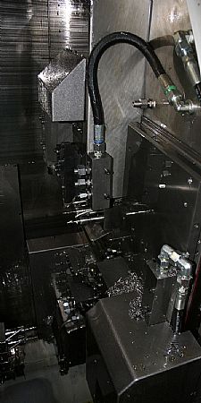 “The Tornos engineers developed all the fixturing and manifolds, that were then manufactured locally. Solenoids were integrated, so oil flow to each of the four positions could be controlled with the machine M-Codes. Flexibility was the key, as the tool platens are constantly moving.”