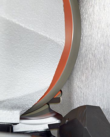 For the machining of tooth faces and tooth tops, the new CM300 can machine the complete tooth geometry of the tooth tops and tooth faces of carbide-tipped circular saw blades in one clamping operation. Two grinding spindles with an output of 2200 watts can each accept various grinding wheels, this is due to the new automatic tool management. The high mass of the grinding unit and the rigidity of the grinding spindles enable circular saw blades to be sharpened precisely to the micron. The tooth geometry of the cutting edges is automatically measured and various fibres and bevel grinding angles are ground in one setting.