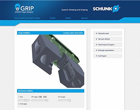 SCHUNK eGrip is the world’s first fully automatic 3D design tool for additively manufactured gripper fingers. SCHUNK eGrip needs only minimal data for the fully automatic calculation of the optimal 3D contour, pricing and delivery schedule. The license-free, browser-based web tool from the competence leader for clamping tech-nology and gripping systems, reduces the design and ordering time for customized gripper fingers to only 15 minutes.